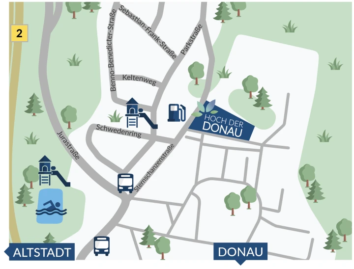 Das Wohnensemble „Hoch der Donau“ liegt im neuen „Alfred-Delp-Quartier“. Hier entsteht auf dem Schellenberg im Stadtteil Parkstadt ein gut erschlossenes und lebenswertes Wohnquartier. Neben schönen Parkanlagen und Grünflächen, die im Rahmen der Landesgartenschau gestaltet werden, befinden sich dort auch Einkaufsmöglichkeiten, Cafés, Praxen und Kinderbetreuungseinrichtungen. Darüber hinaus entsteht ein attraktives Angebot an Freiflächen für Sport, Spiel und Freizeit.